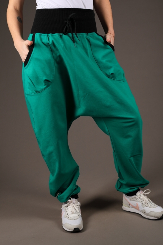 Spodní délka nohavic je stažená do černého nápletu.