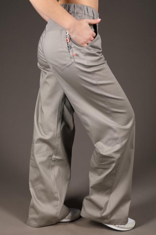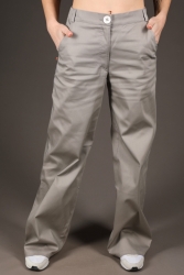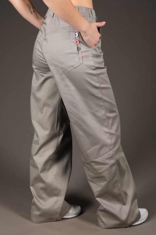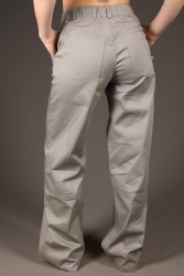 Vyšší sed, užší přes boky a dole širší střih nohavic.
