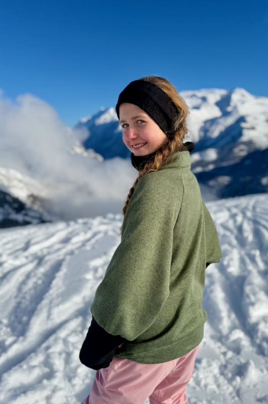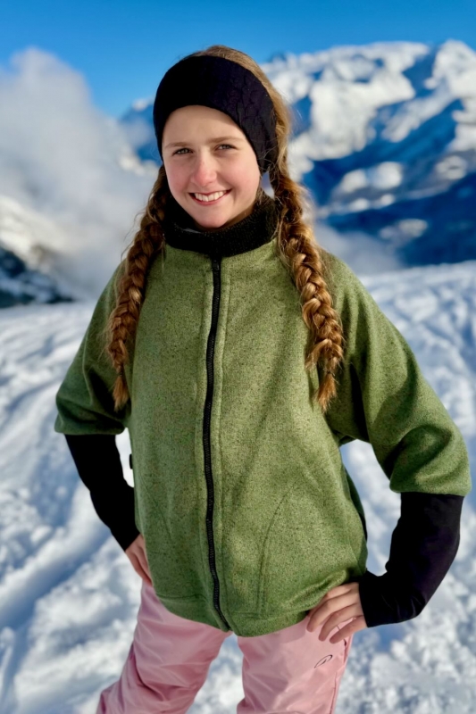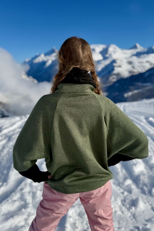 Khaki mikina s netopýřími rukávy a černými detaily.