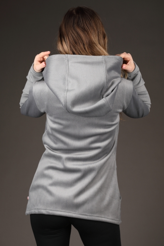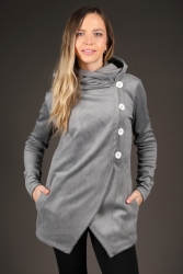 Volnější cardigan střih. Projmutý pas.