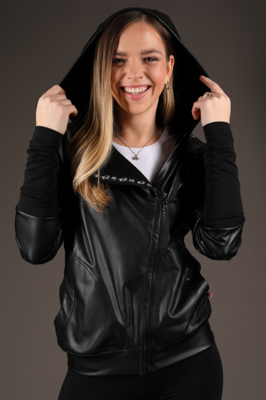 Černá koženková mikina s kapucí.