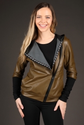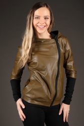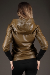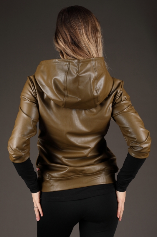 Khaki koženková mikina s kapucí.