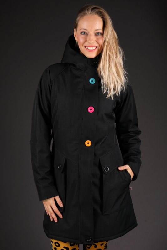 Parádně propracovaný zimní kabát s barevnými knoflíky.