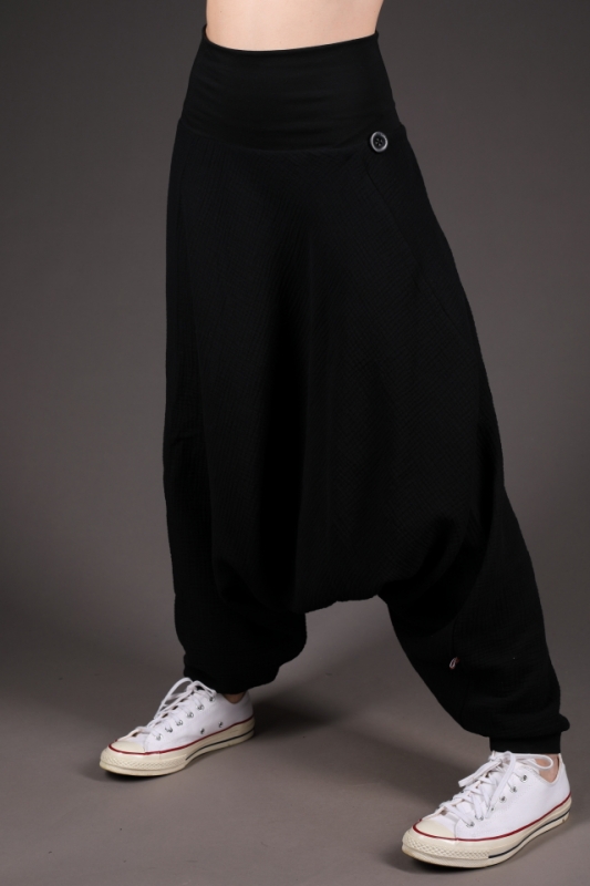 Volné kalhoty s pružným pasem.