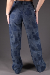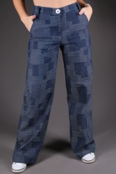 Vyšší sed, užší přes boky a dole širší střih nohavic.