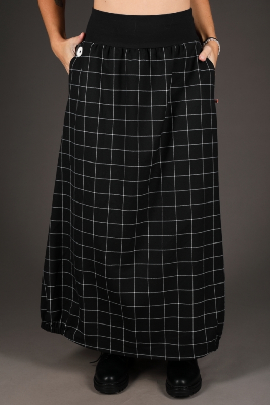 Dlouhá kostkovaná sukně s pružným pasem.