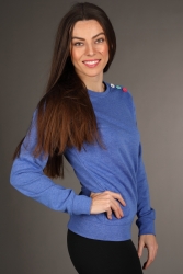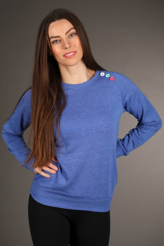 Světle modrá mikina přes hlavu s barevnými knoflíčky.
