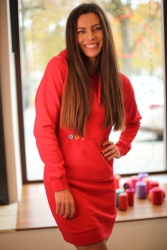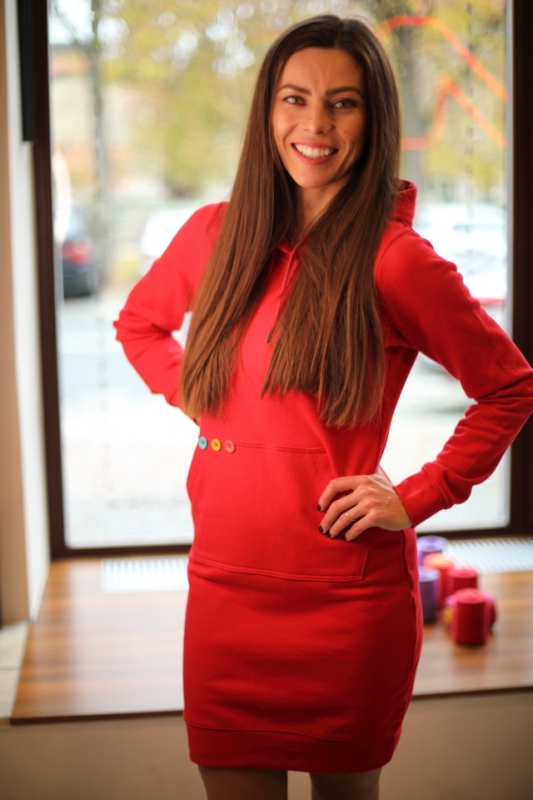 Krásně červená a pěkně dlouhá mikina s kapucí.