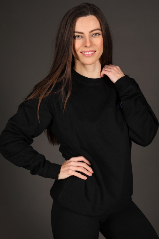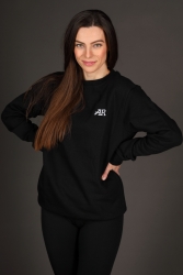 Modelka měří 166 cm. Na fotce má mikinu vel.M a běžně nosí vel.38.