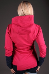 Tmavě růžová mikina s modrými detaily.