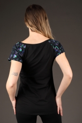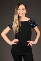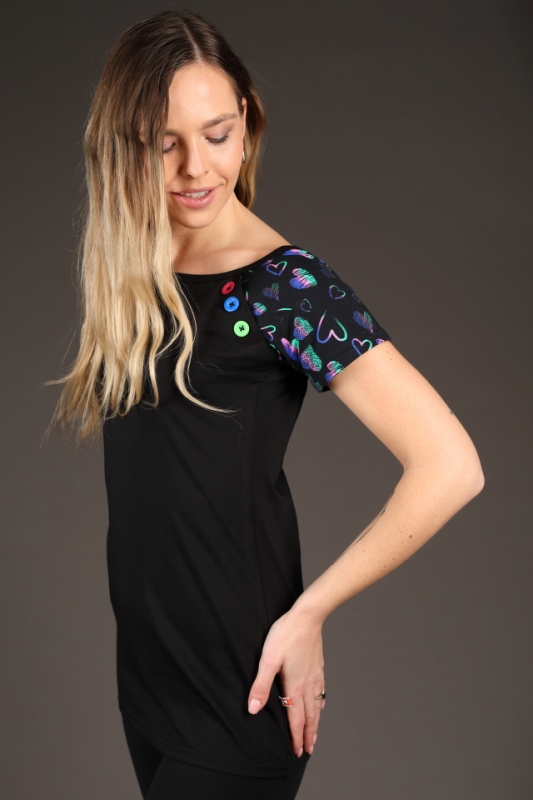 Prodloužené tričko s barevnými rukávy a knoflíčky.